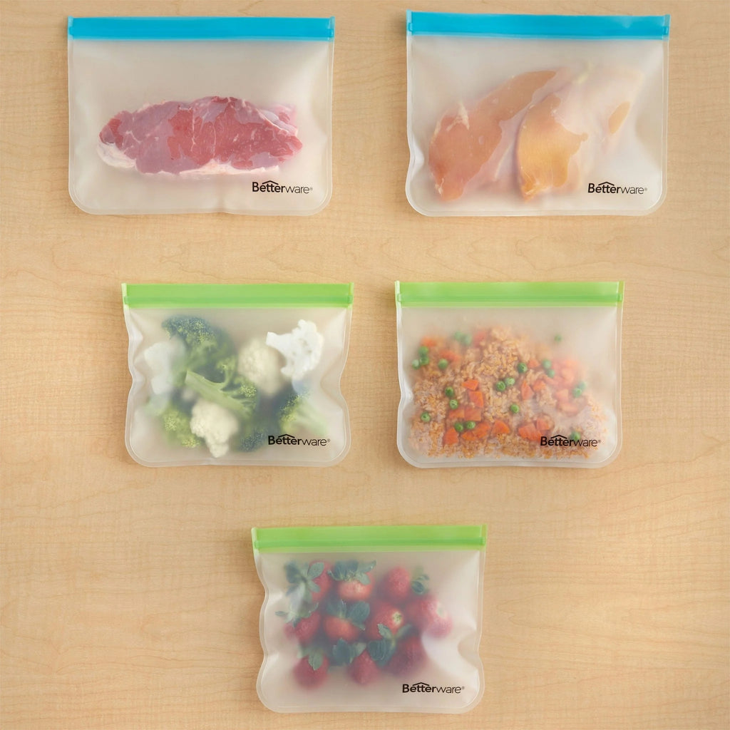 Conserva y separa tus alimentos en el refrigerador con el Set Bolzips Betterware. Este set de 5 bolsas reutilizables elaboradas con material resistente, son herméticas e ideales para transportar y guardar tus alimentos ya sea en refrigerador o congelador.
