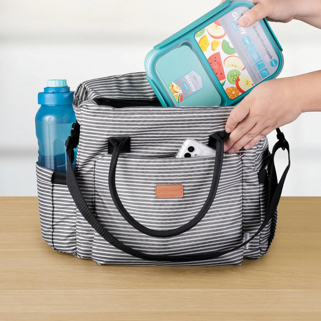 Transporta y conserva tus alimenos con gran estilo y capacidad con la Mega Bag Lunch Betterware. Esta solución para llevar contigo tiene una gran capacidad, interior térmico para mantener tus alimentos frescos, 5 compartimentos para organizar todo lo que necesites y asa ajustable. Ahora su gran tamaño permite transportar también tu botella de agua.